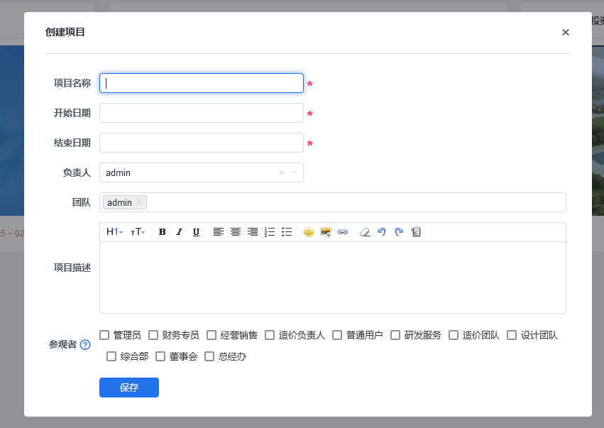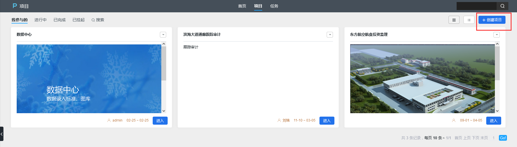 登录经管系统,进入项目模块,选择项目,点击页面右上角的“创建项目”即可出现创建项目的页面。