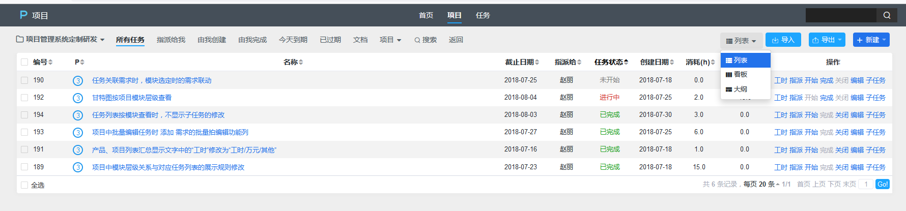 - 任务筛选:可以通过左侧的各种检索标签来检索相应的任务。比如查看指派给自己的任务等等。