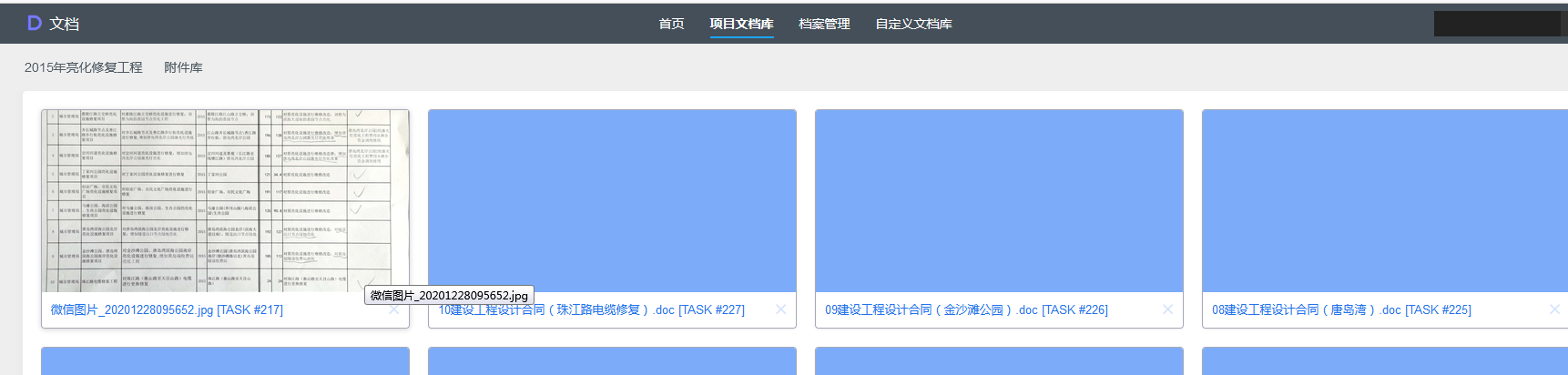 其中附件库存放该项目中所有上传的相关附件。附件名称后,会显示该附件相关的任务、文档编号,点击可以直接跳转到该任务或文档详情页面。