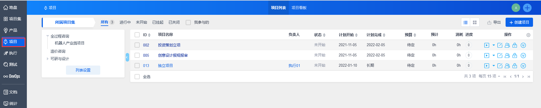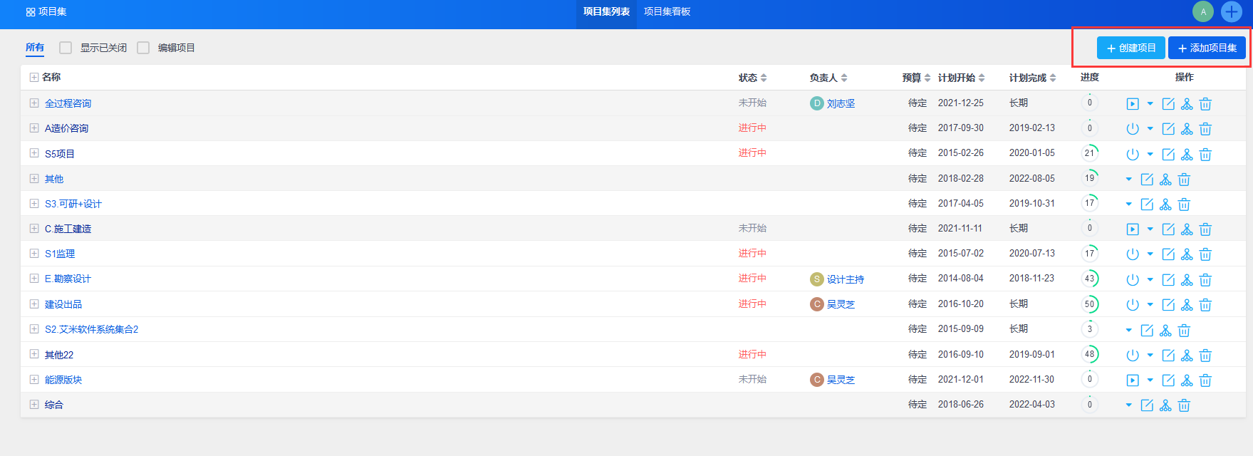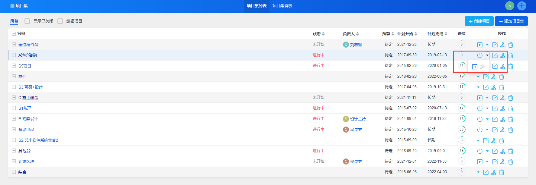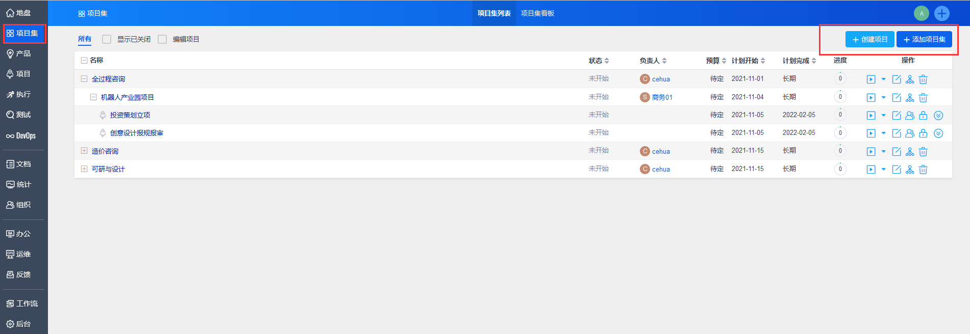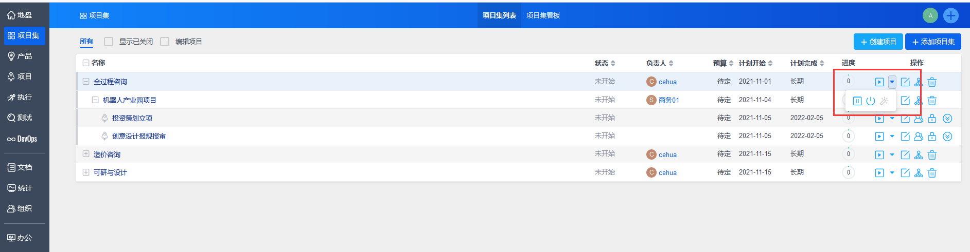 点击“保存”后,自动返回到项目集列表。可以通过操作部分的按钮,对项目集进行操作,包括启动、挂起、关闭、编辑以及删除项目集,还可以为项目集创建子项目集。