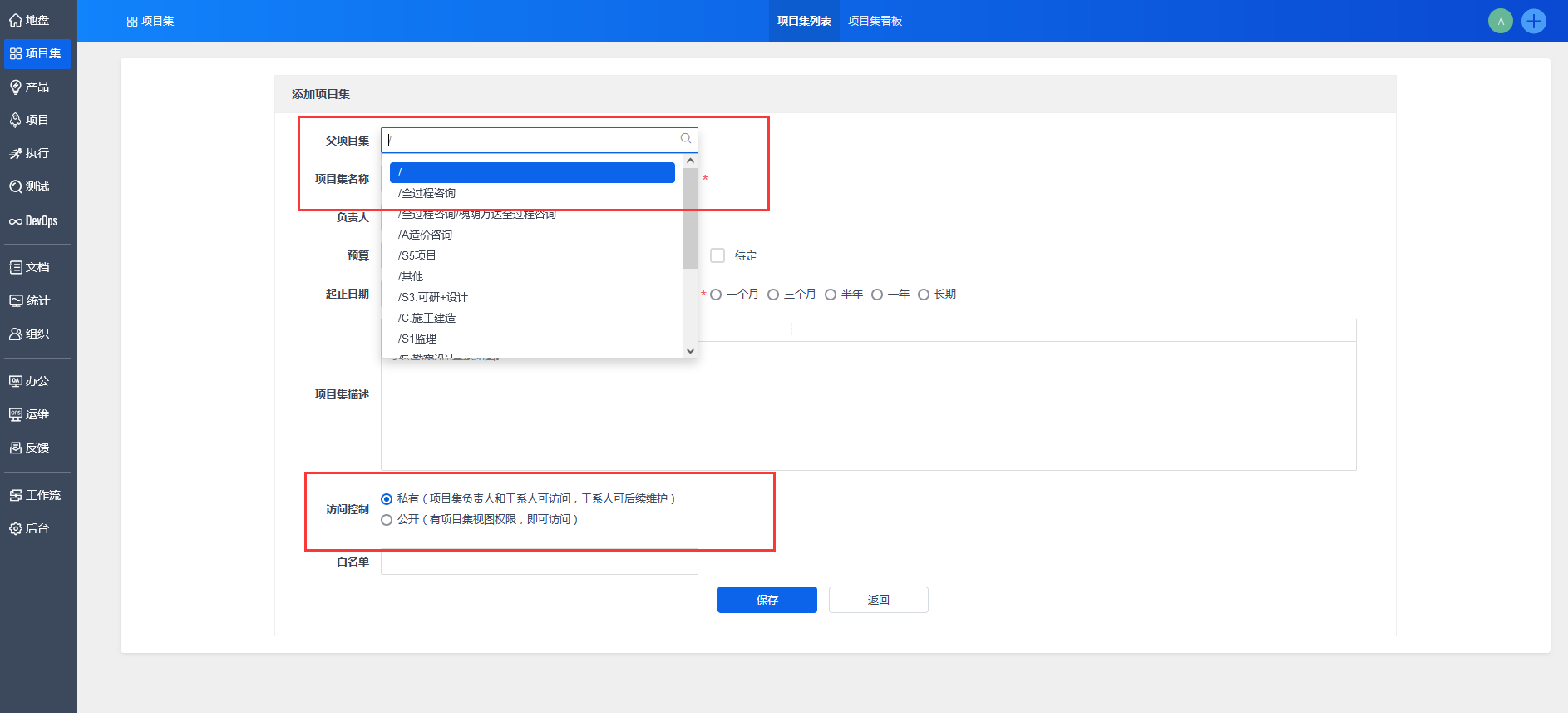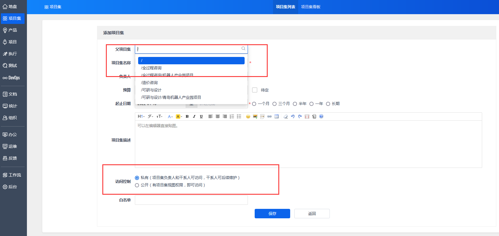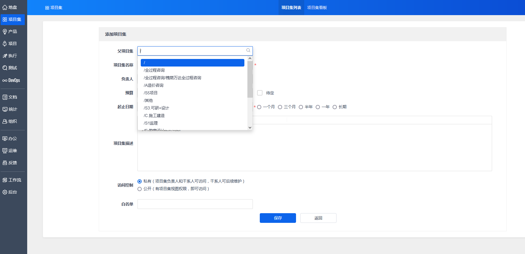 点击“添加项目集”,进入页面填写项目集相关信息。