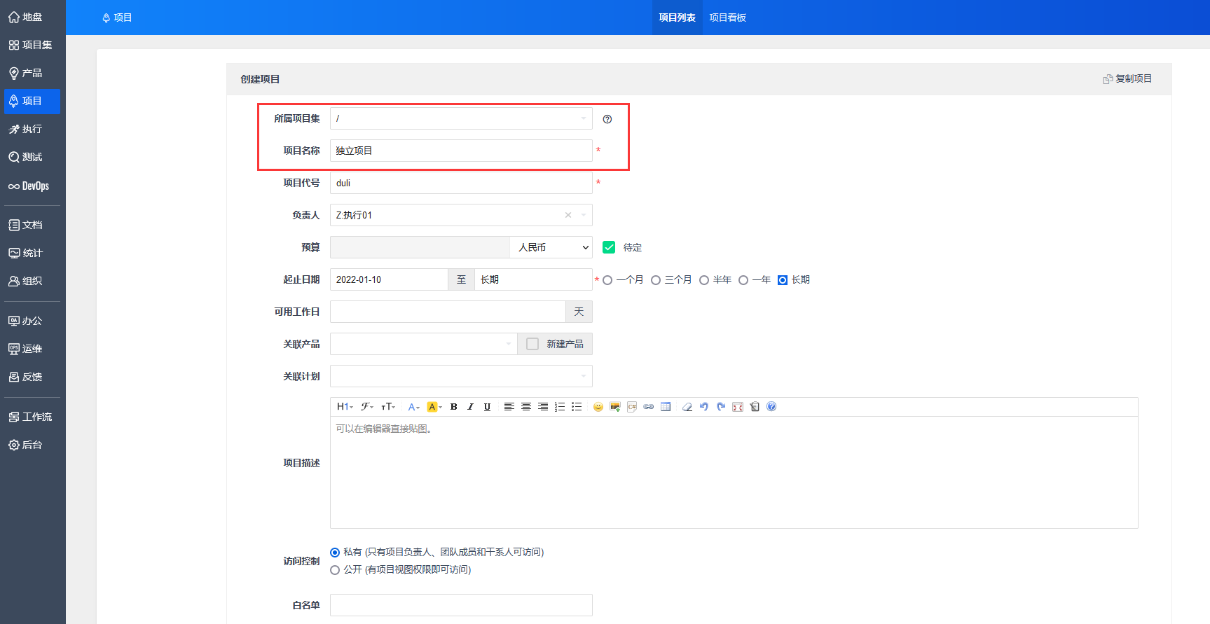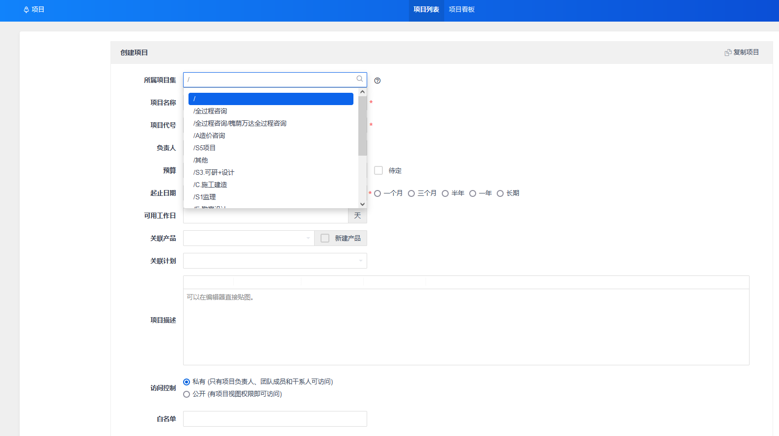 点击“创建项目”,进入项目创建页面。可以选择已存在的项目集,或者独立项目。