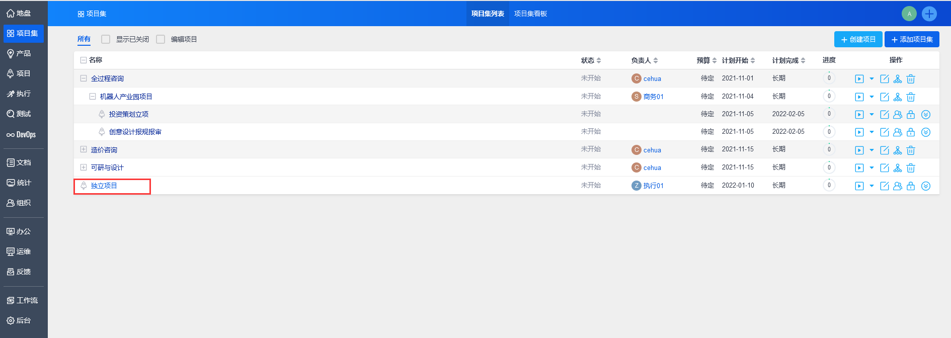 点击“保存”后,自动返回到项目集列表。可以看到该独立项目和项目集处于同级的结构。
