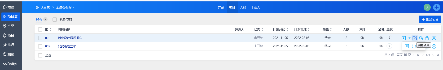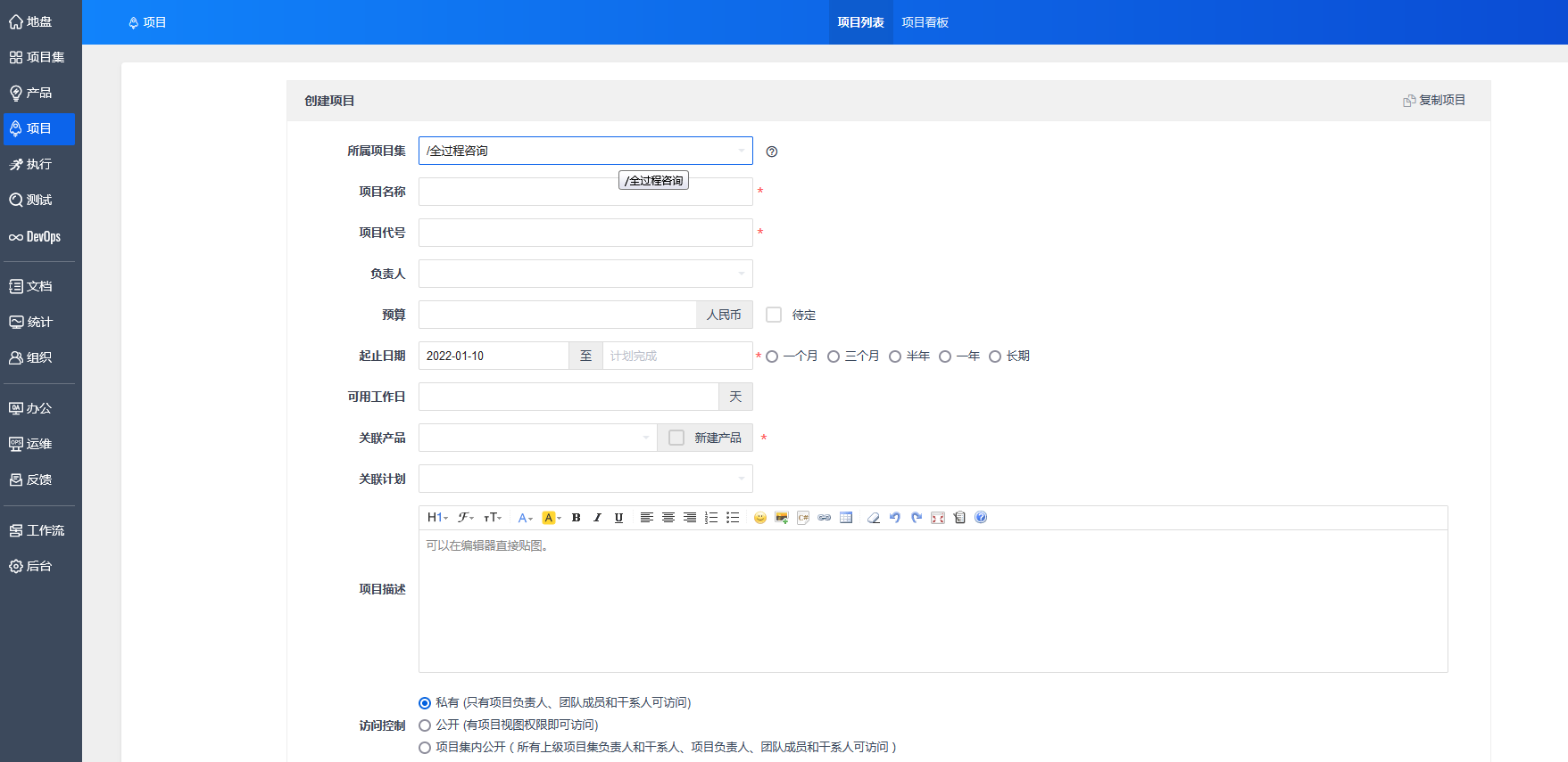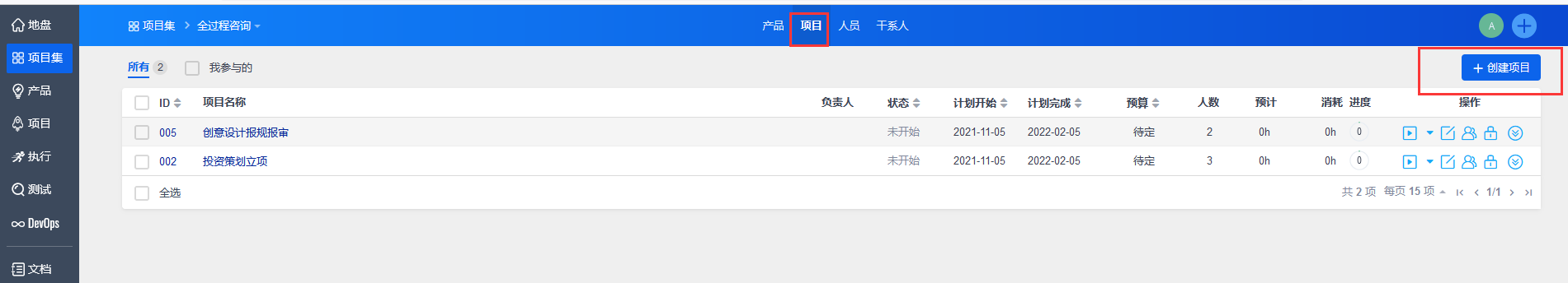 在项目集下,可以创建项目并查看项目集所有的项目。如点选择“全过程咨询”,点击“项目”-“创建项目”。