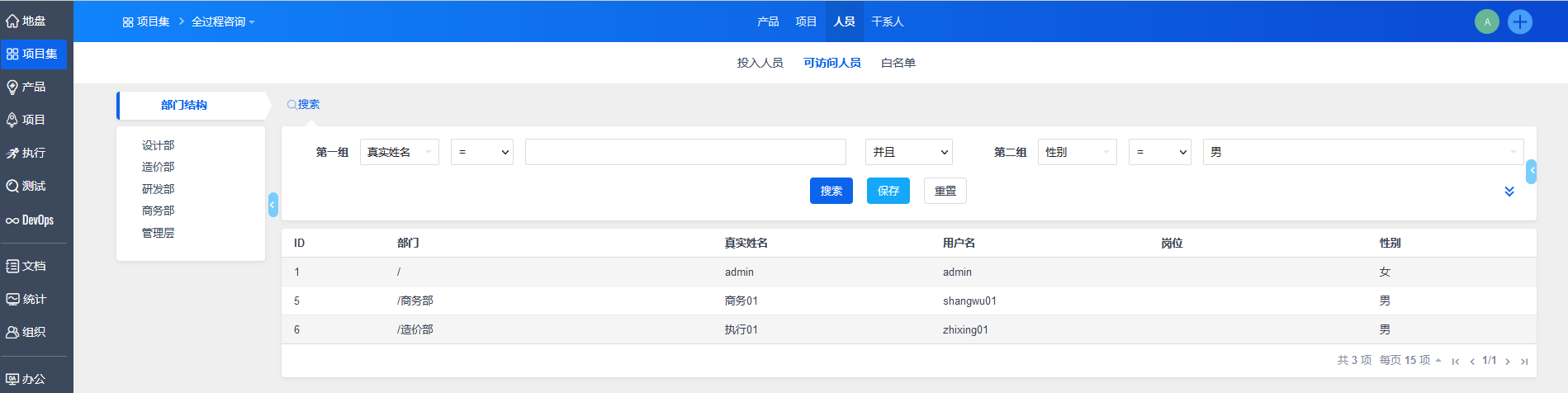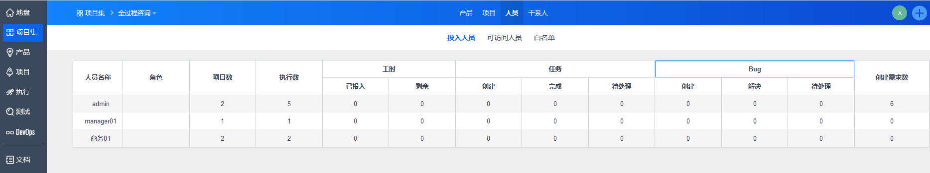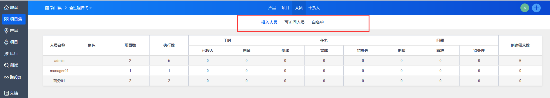 选择一个项目集,点击“人员”,可以对“投入人员”、“可访问人员”以及“白名单”进行查看和管理。
