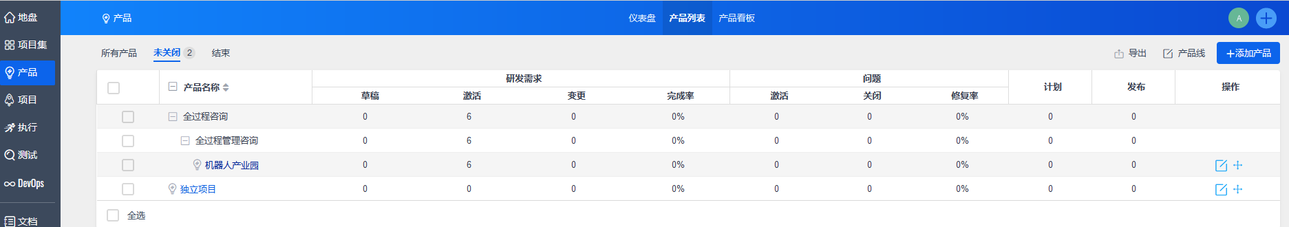在“产品”-“产品列表”页面,可以按项目集、项目查看其关联产品。还可以添加产品、编辑产品线、或者导出产品列表。