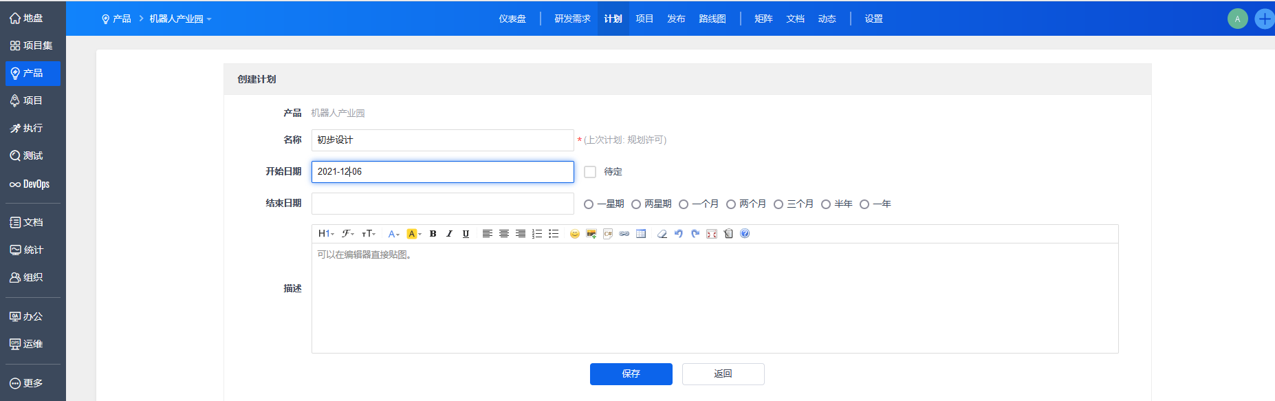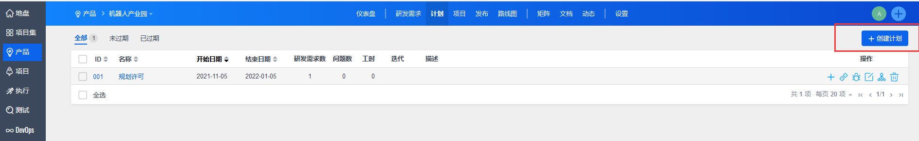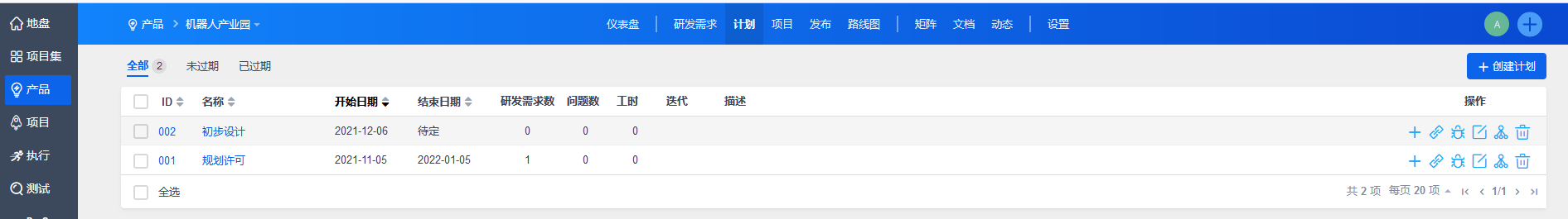 点击保存后,自动返回计划列表。可以通过操作按钮关联研发需求、关联问题、编辑计划、创建子计划或者删除计划。