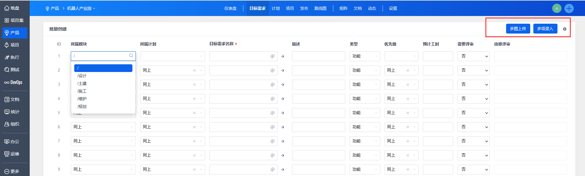 点击“提目标需求”-“批量创建”。可以选择“多图上传”和“多项录入”