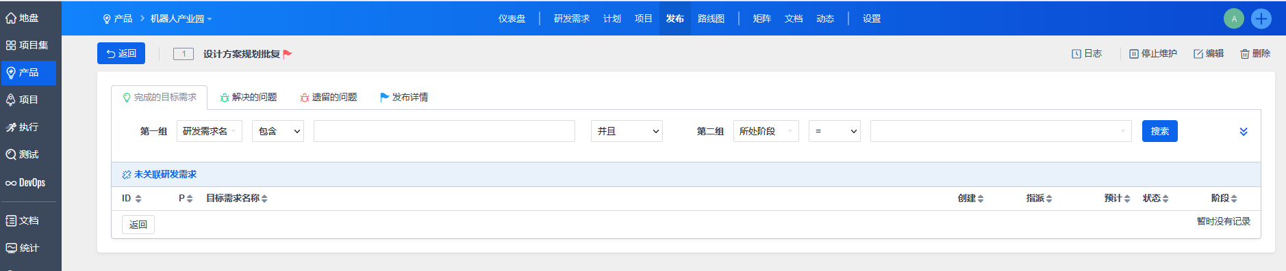 点击“保存”后,进入该发布详情页面。需要为此次发布关联需求、已解决问题、以及遗留的问题等。可以通过设置条件,进行“搜索”,然后批量关联。