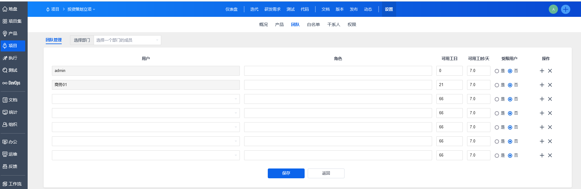 在“设置”-“团队”下,添加项目成员,编辑“可用工日”和“可用工时/天”。