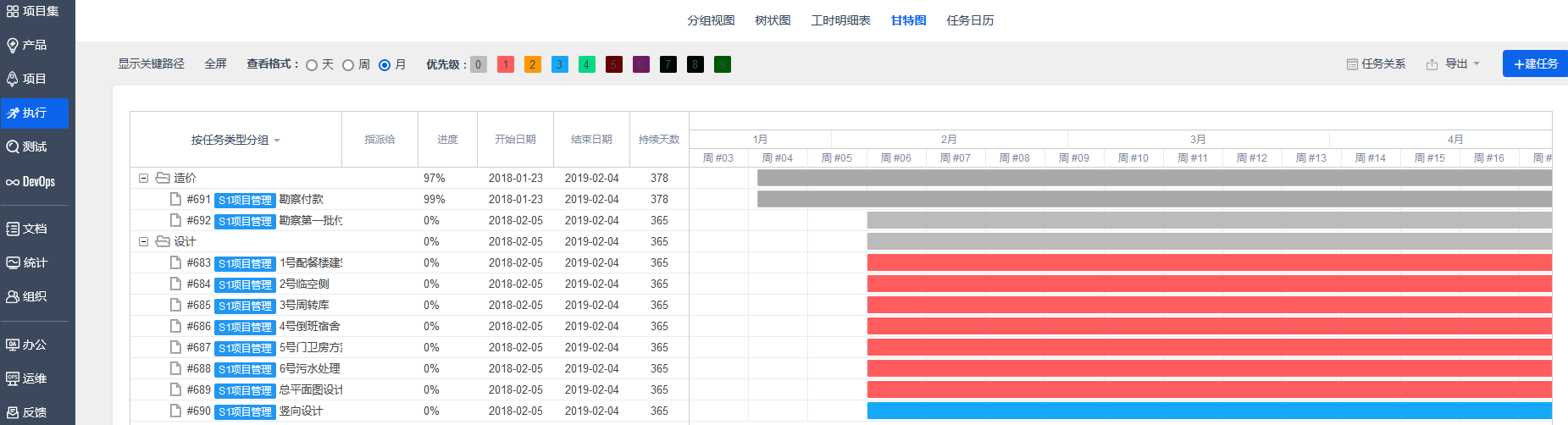 可以按照分组视图、树状图以及甘特图等各类型进行查看进度。 以甘特图为例: