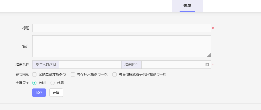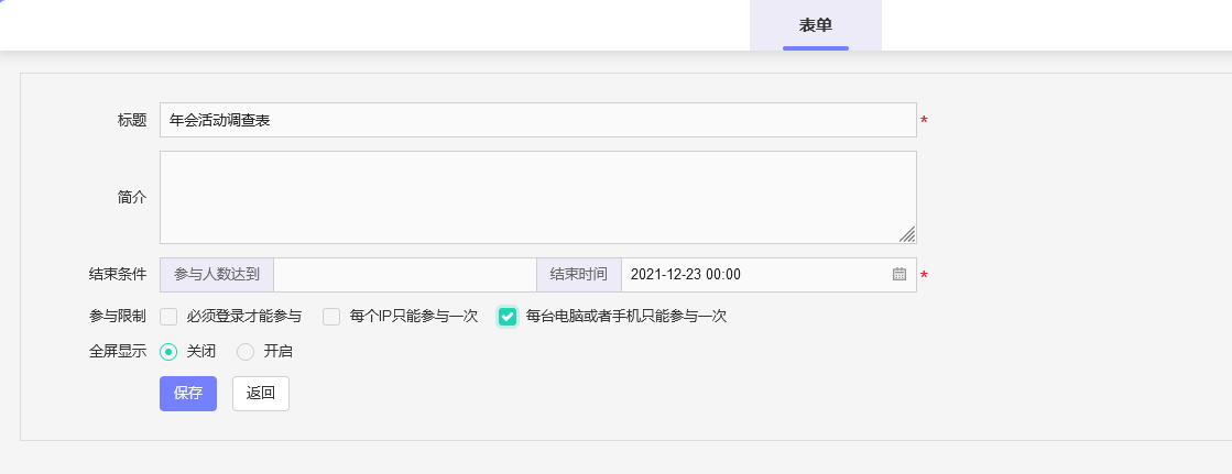 创建表单时 设定表单标题、表单结束的条件,到达一定的人数或者设定结束时间、还可以设定参与的限制,是否必须登录,以及每台电脑和手机是否可以重复参与