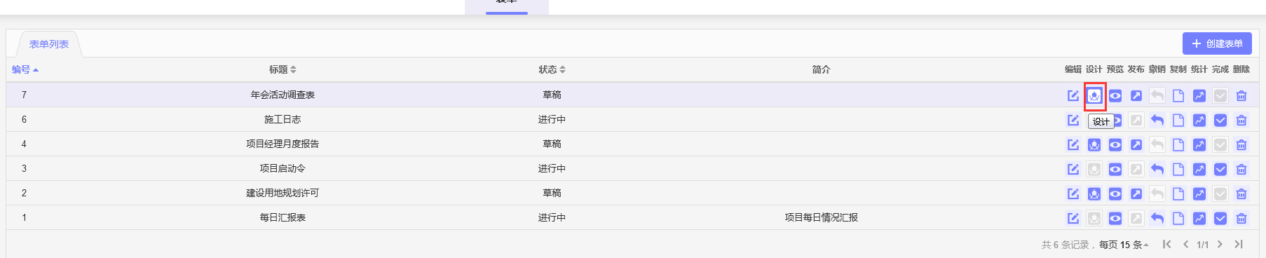 创建表单之后,在表单列表操作栏可以对新添加的表单进行各种操作,如:编辑、设计、删除等