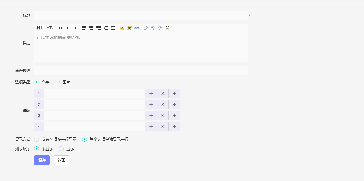 添加常用题型: 选选择题型形式 再进行编辑,添加标题、描述、选项、显示方式以及检查规则等。 以 单选为例: