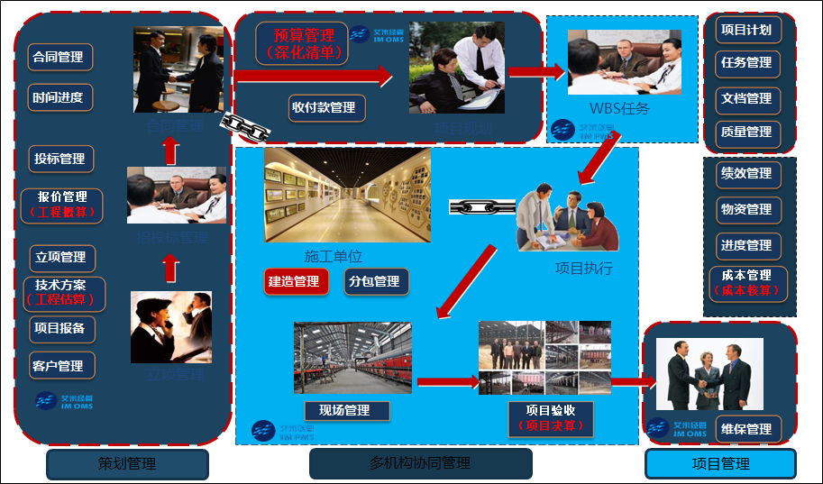 项目管理流程繁琐,管理难度大,项目进度难以监控、成本不能控制。针对当前项目管理存在的问题,研发出了高效的项目管理专业化平台,解决项目管理有关的立项、招投标管理、进度管理、合同管理、材料管理、分包管理、施工管理、进度管理、验收管理等流程难题,还提供可选择使用的扩充功能,如协同办公、人力资源、人事管理等,通过该平台将这些业务流程有效地串接,实现项目管理的信息化、规范化。最大化地协调各方面资源,协同管理、提升管理效率。