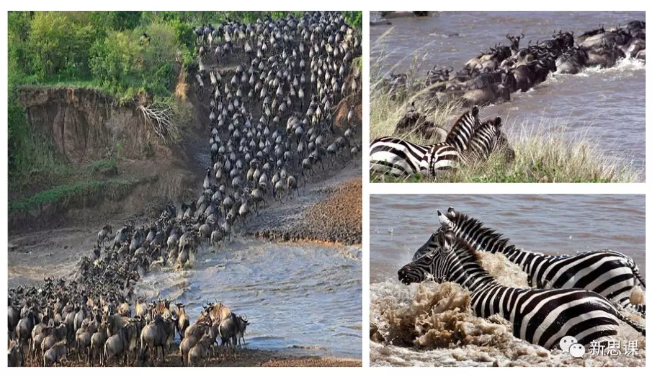几年前我去访问非洲时正好遇上角马迁徙,它们要从坦桑尼亚的塞伦盖蒂草原穿越一条河流,到达肯尼亚水草肥美的马塞马拉公园。角马渡河的时候非常危险,水中的鳄鱼,守候在岸边的猎豹,全都虎视眈眈。跟角马同时渡河的还有斑马。非洲当地的马赛人提醒我仔细看,角马和斑马渡河采取的策略不一样。