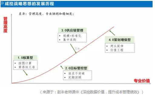 赵老师向我们介绍了我国的地产成本管理经历了核算型、控制型、价值创造型三个阶段之后,已进入策划型的成本管理。赵老师认为,“策划型”成本管理的基本步骤就是“先找问题、再理”,关键在跨界协同。