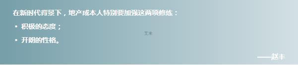 开朗的性格下,日积月累就会形成你的情商。对于情商,我在宝龙集团工作期间还未意识到情商的重要性,当时也觉得不屑一顾。到了恒基工作后,才开始慢慢注意讲话方式,也取得了一些让自己欣喜的效果。知道了怎么说、怎么做,才能更好地达到推动工作的目的——这就是有情商的表现了。